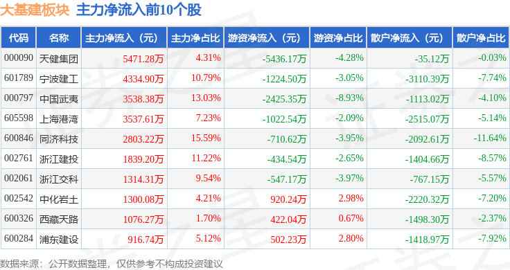从资金流向上来看,当日大基建板块主力资金净流出10.06亿元,游资资金净流入2.39亿元,散户资金净流入7.66亿元。大基建板块个股资金流向见下表: