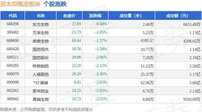 证券之星消息,11月17日芬太尼概念板块较上一交易日下跌2.16%,易瑞生物领跌。当日上证指数报收于3972.03,下跌0.46%。深证成指报收于13202.0,下跌0.11%。芬太尼概念板块个股涨跌见下表: