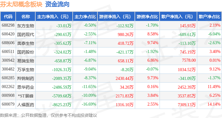 从资金流向上来看,当日芬太尼概念板块主力资金净流出2.15亿元,游资资金净流入7467.35万元,散户资金净流入1.41亿元。芬太尼概念板块个股资金流向见下表: