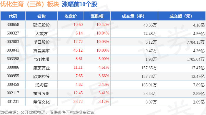 从资金流向上来看,当日优化生育(三孩)板块主力资金净流出15.31亿元,游资资金净流入1.77亿元,散户资金净流入13.54亿元。优化生育(三孩)板块个股资金流向见下表: