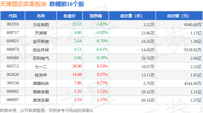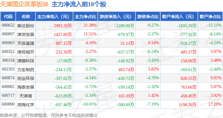 从资金流向上来看,当日天津国企改革板块主力资金净流出4342.74万元,游资资金净流出2731.24万元,散户资金净流入7073.98万元。天津国企改革板块个股资金流向见下表: