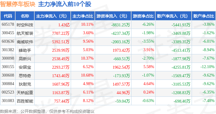 从资金流向上来看,当日智慧停车板块主力资金净流入1319.81万元,游资资金净流出811.58万元,散户资金净流出508.23万元。智慧停车板块个股资金流向见下表: