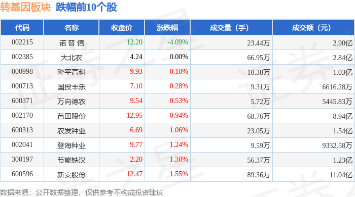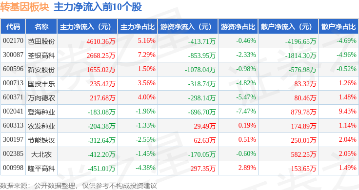 从资金流向上来看,当日转基因板块主力资金净流入6042.73万元,游资资金净流出2023.9万元,散户资金净流出4018.83万元。转基因板块个股资金流向见下表: