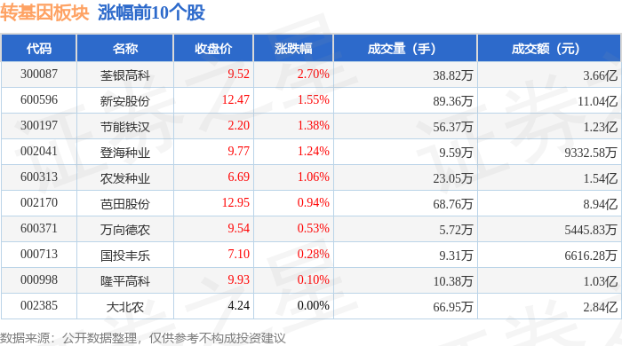 证券之星消息,11月17日转基因板块较上一交易日上涨0.47%,荃银高科领涨。当日上证指数报收于3972.03,下跌0.46%。深证成指报收于13202.0,下跌0.11%。转基因板块个股涨跌见下表: