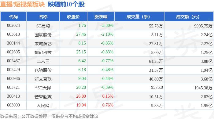 从资金流向上来看,当日直播/短视频板块主力资金净流入11.38亿元,游资资金净流出7.1亿元,散户资金净流出4.28亿元。直播/短视频板块个股资金流向见下表: