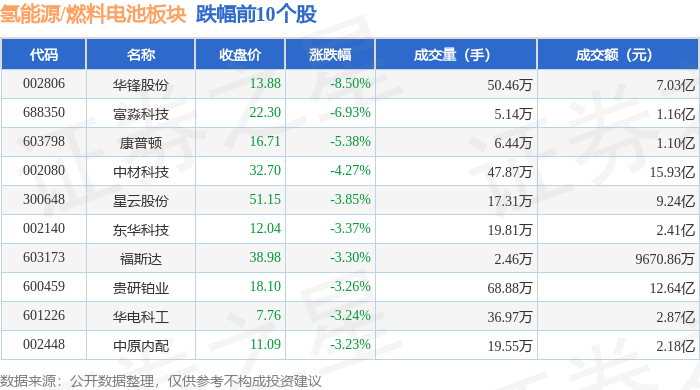 证券之星消息,11月17日氢能源/燃料电池板块较上一交易日下跌0.22%,华锋股份领跌。当日上证指数报收于3972.03,下跌0.46%。深证成指报收于13202.0,下跌0.11%。氢能源/燃料电池板块个股涨跌见下表: