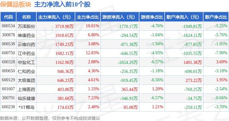 从资金流向上来看,当日保健品板块主力资金净流出12.24亿元,游资资金净流入8093.86万元,散户资金净流入11.43亿元。保健品板块个股资金流向见下表: