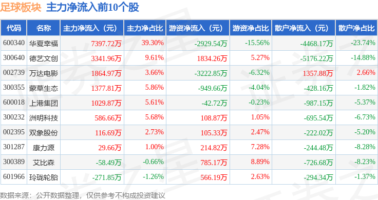 从资金流向上来看,当日足球板块主力资金净流出1.94亿元,游资资金净流出1385.3万元,散户资金净流入2.08亿元。足球板块个股资金流向见下表: