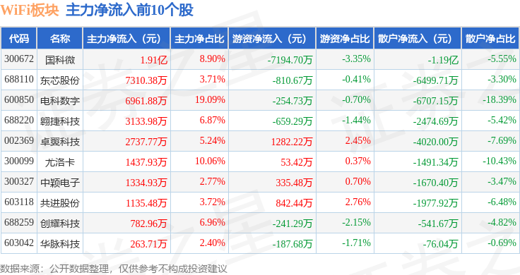 从资金流向上来看,当日WiFi板块主力资金净流出12.62亿元,游资资金净流入2.84亿元,散户资金净流入9.78亿元。WiFi板块个股资金流向见下表: