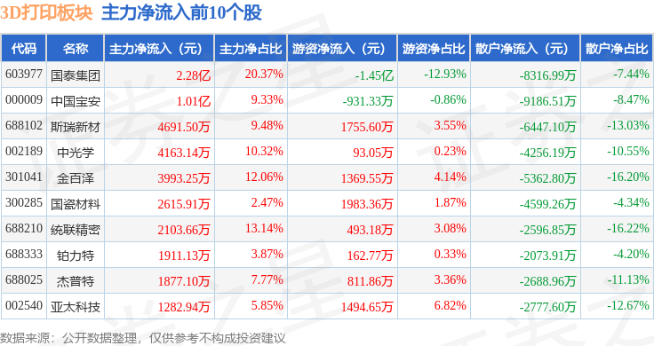 从资金流向上来看,当日3D打印板块主力资金净流入6059.24万元,游资资金净流入3243.59万元,散户资金净流出9302.83万元。3D打印板块个股资金流向见下表: