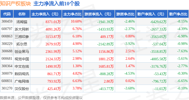 从资金流向上来看,当日知识产权板块主力资金净流入7334.52万元,游资资金净流入2194.3万元,散户资金净流出9528.81万元。知识产权板块个股资金流向见下表: