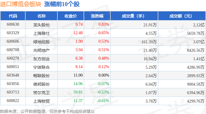证券之星消息,11月17日进口博览会板块较上一交易日下跌0.25%,兰生股份领跌。当日上证指数报收于3972.03,下跌0.46%。深证成指报收于13202.0,下跌0.11%。进口博览会板块个股涨跌见下表:
