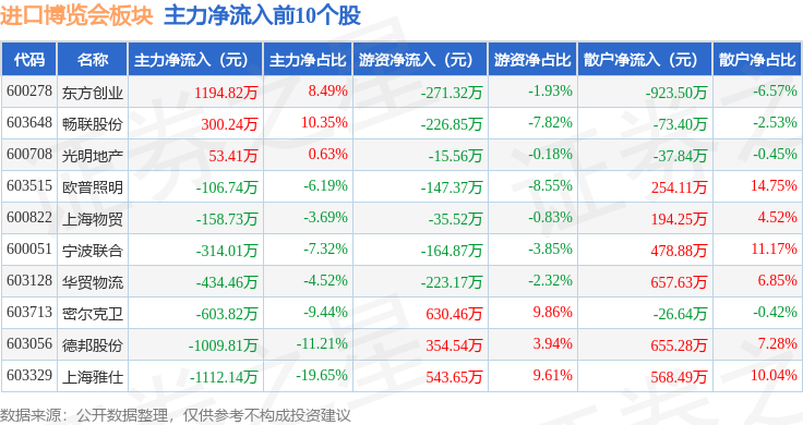 从资金流向上来看,当日进口博览会板块主力资金净流出1.21亿元,游资资金净流入3843.21万元,散户资金净流入8287.49万元。进口博览会板块个股资金流向见下表: