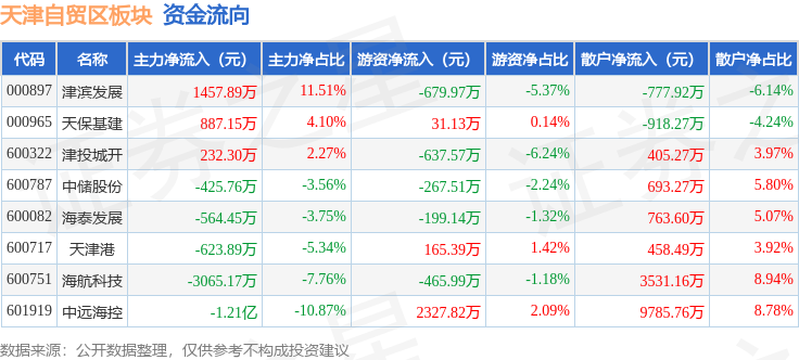 从资金流向上来看,当日天津自贸区板块主力资金净流出1.42亿元,游资资金净流入274.16万元,散户资金净流入1.39亿元。天津自贸区板块个股资金流向见下表: