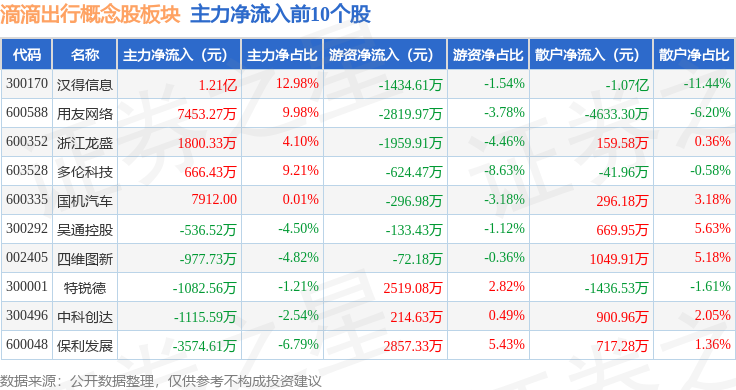 从资金流向上来看,当日滴滴出行概念股板块主力资金净流出7763.37万元,游资资金净流入9843.2万元,散户资金净流出2079.83万元。滴滴出行概念股板块个股资金流向见下表: