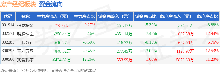 从资金流向上来看,当日房产经纪板块主力资金净流出7363.86万元,游资资金净流出542.5万元,散户资金净流入7906.36万元。房产经纪板块个股资金流向见下表: