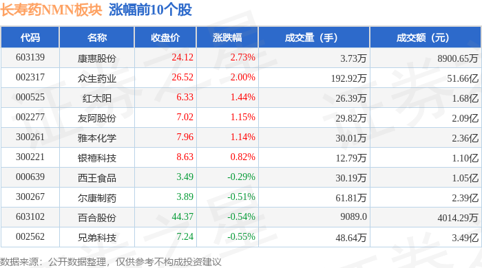 证券之星消息,11月17日长寿药NMN板块较上一交易日下跌0.57%,特一药业领跌。当日上证指数报收于3972.03,下跌0.46%。深证成指报收于13202.0,下跌0.11%。长寿药NMN板块个股涨跌见下表: