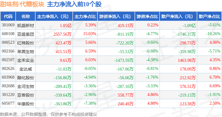 从资金流向上来看,当日甜味剂/代糖板块主力资金净流出5357.48万元,游资资金净流入3535.49万元,散户资金净流入1821.98万元。甜味剂/代糖板块个股资金流向见下表: