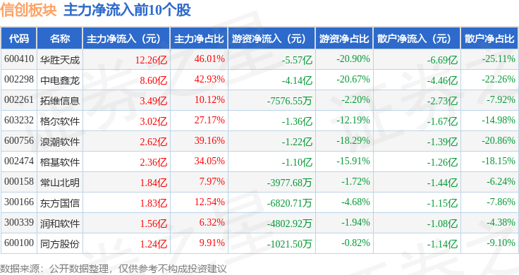 从资金流向上来看,当日信创板块主力资金净流入49.51亿元,游资资金净流出19.66亿元,散户资金净流出29.84亿元。信创板块个股资金流向见下表: