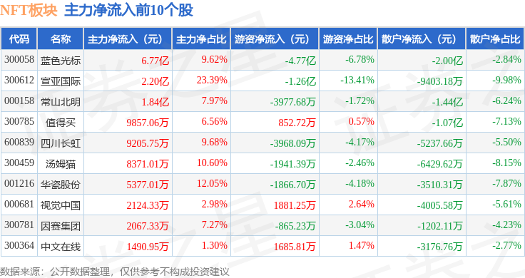 从资金流向上来看,当日NFT板块主力资金净流出2.74亿元,游资资金净流出2.34亿元,散户资金净流入5.08亿元。NFT板块个股资金流向见下表: