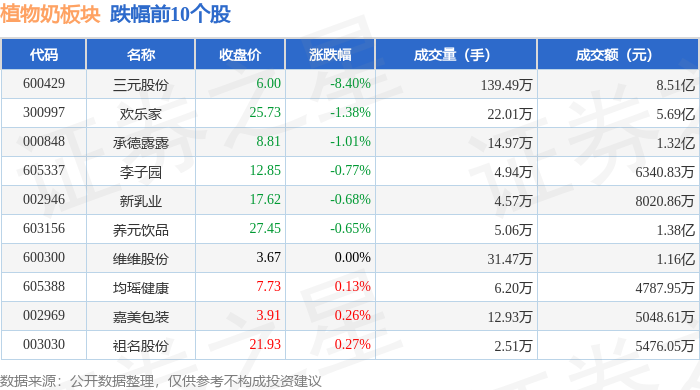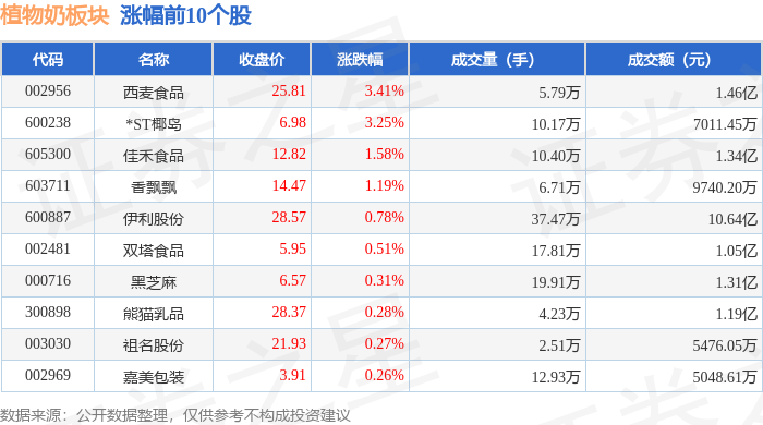 证券之星消息,11月17日植物奶板块较上一交易日上涨0.16%,西麦食品领涨。当日上证指数报收于3972.03,下跌0.46%。深证成指报收于13202.0,下跌0.11%。植物奶板块个股涨跌见下表: