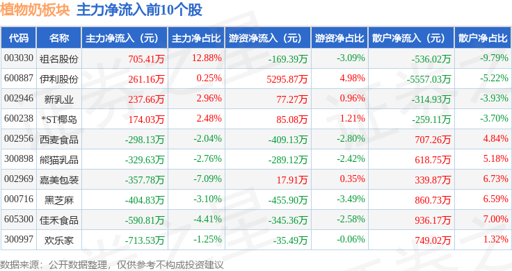从资金流向上来看,当日植物奶板块主力资金净流出1.17亿元,游资资金净流入7276.99万元,散户资金净流入4407.1万元。植物奶板块个股资金流向见下表: