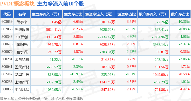 从资金流向上来看,当日PVDF概念板块主力资金净流出2.42亿元,游资资金净流入2537.01万元,散户资金净流入2.17亿元。PVDF概念板块个股资金流向见下表: