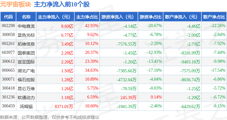 从资金流向上来看,当日元宇宙板块主力资金净流入530.88万元,游资资金净流出7.48亿元,散户资金净流入7.42亿元。元宇宙板块个股资金流向见下表: