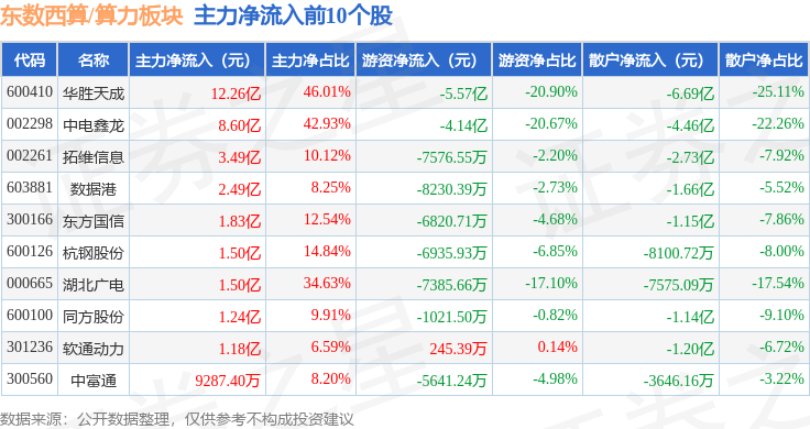 从资金流向上来看,当日东数西算/算力板块主力资金净流入18.61亿元,游资资金净流出14.39亿元,散户资金净流出4.22亿元。东数西算/算力板块个股资金流向见下表: