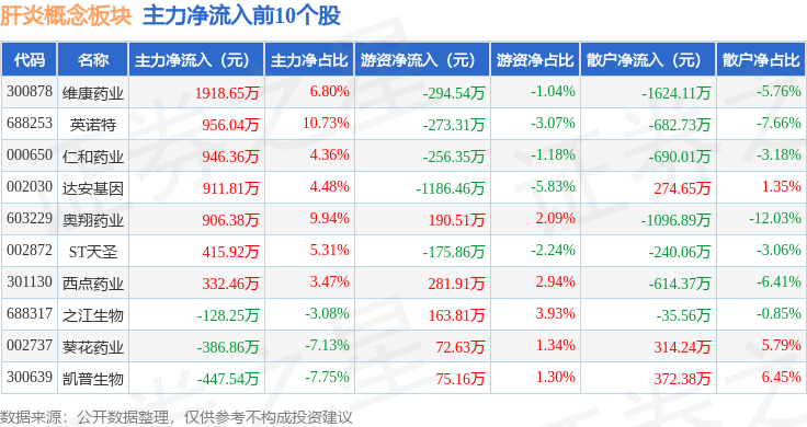 从资金流向上来看,当日肝炎概念板块主力资金净流出6.12亿元,游资资金净流入1.75亿元,散户资金净流入4.37亿元。肝炎概念板块个股资金流向见下表: