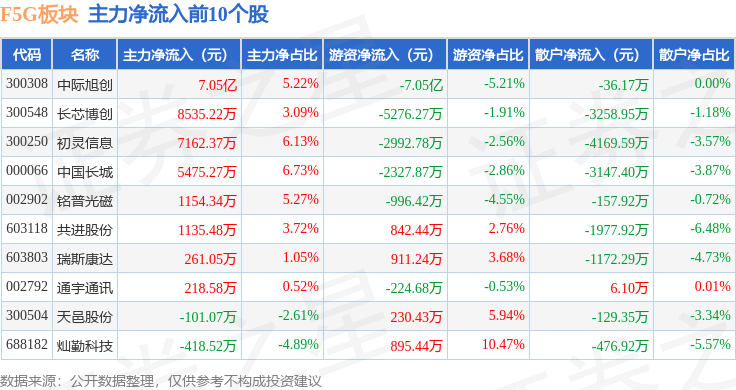 从资金流向上来看,当日F5G板块主力资金净流入6.83亿元,游资资金净流出6.11亿元,散户资金净流出7225.52万元。F5G板块个股资金流向见下表: