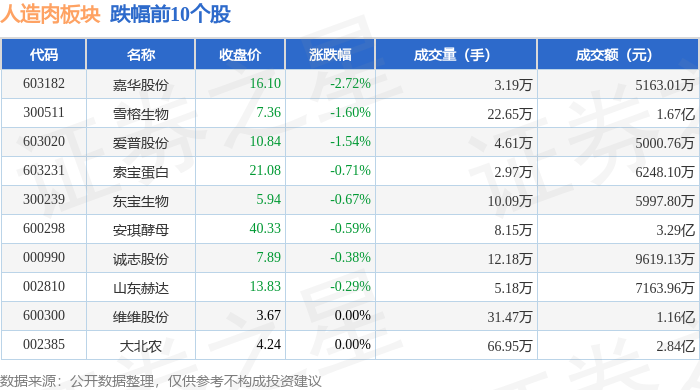 证券之星消息,11月17日人造肉板块较上一交易日上涨0.56%,金字火腿领涨。当日上证指数报收于3972.03,下跌0.46%。深证成指报收于13202.0,下跌0.11%。人造肉板块个股涨跌见下表: