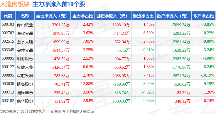从资金流向上来看,当日人造肉板块主力资金净流出1187.54万元,游资资金净流入1352.63万元,散户资金净流出165.09万元。人造肉板块个股资金流向见下表: