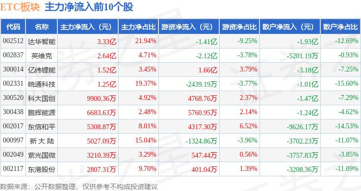 从资金流向上来看,当日ETC板块主力资金净流入11.1亿元,游资资金净流出1.0亿元,散户资金净流出10.1亿元。ETC板块个股资金流向见下表:
