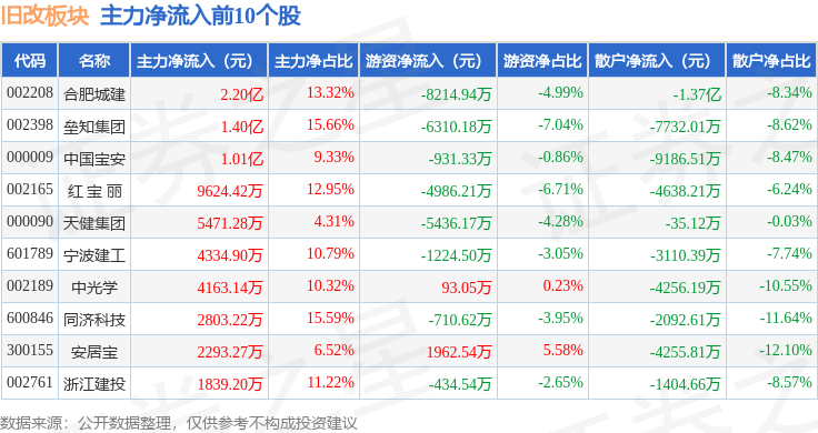 从资金流向上来看,当日旧改板块主力资金净流出3.42亿元,游资资金净流入6062.34万元,散户资金净流入2.82亿元。旧改板块个股资金流向见下表: