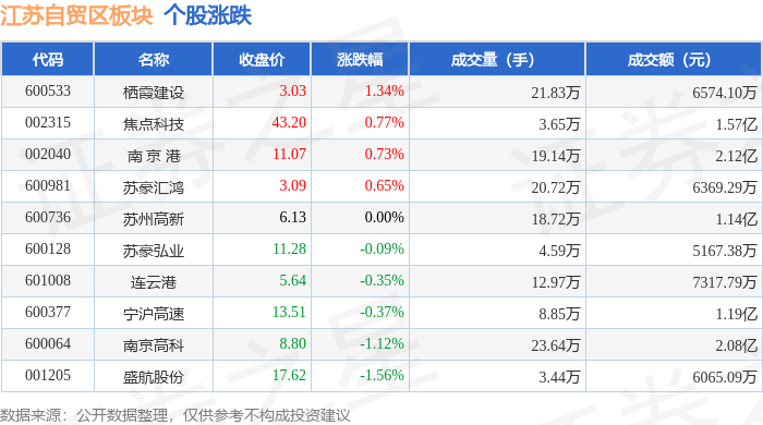 证券之星消息,11月17日江苏自贸区板块较上一交易日下跌0.22%,盛航股份领跌。当日上证指数报收于3972.03,下跌0.46%。深证成指报收于13202.0,下跌0.11%。江苏自贸区板块个股涨跌见下表: