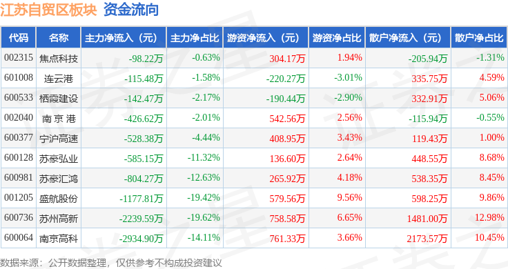 从资金流向上来看,当日江苏自贸区板块主力资金净流出9052.91万元,游资资金净流入3346.98万元,散户资金净流入5705.93万元。江苏自贸区板块个股资金流向见下表: