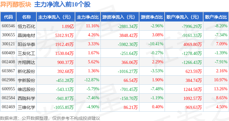 从资金流向上来看,当日异丙醇板块主力资金净流出5296.39万元,游资资金净流出558.58万元,散户资金净流入5854.97万元。异丙醇板块个股资金流向见下表: