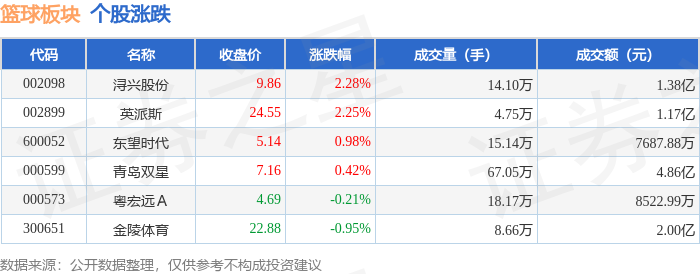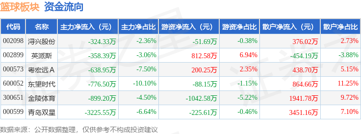 从资金流向上来看,当日篮球板块主力资金净流出6222.92万元,游资资金净流出395.21万元,散户资金净流入6618.13万元。篮球板块个股资金流向见下表: