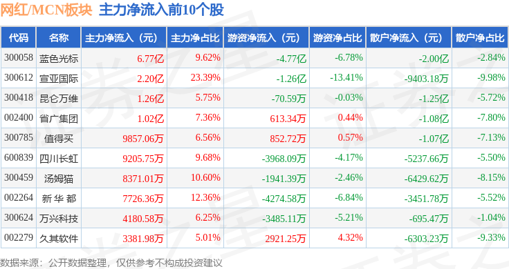 从资金流向上来看,当日网红/MCN板块主力资金净流出8889.11万元,游资资金净流出5.16亿元,散户资金净流入6.05亿元。网红/MCN板块个股资金流向见下表: