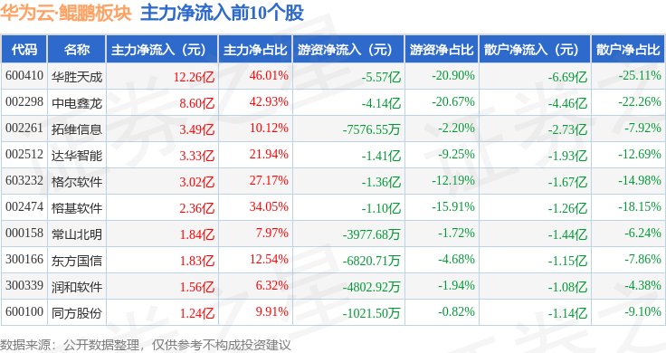 从资金流向上来看,当日华为云·鲲鹏板块主力资金净流入44.47亿元,游资资金净流出16.38亿元,散户资金净流出28.09亿元。华为云·鲲鹏板块个股资金流向见下表: