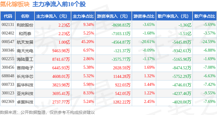 从资金流向上来看,当日氮化镓板块主力资金净流出18.03亿元,游资资金净流入1.29亿元,散户资金净流入16.75亿元。氮化镓板块个股资金流向见下表: