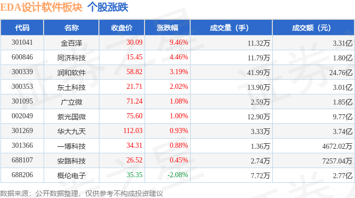 证券之星消息,11月17日EDA设计软件板块较上一交易日上涨1.44%,金百泽领涨。当日上证指数报收于3972.03,下跌0.46%。深证成指报收于13202.0,下跌0.11%。EDA设计软件板块个股涨跌见下表: