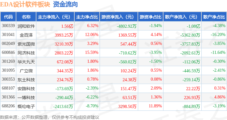 从资金流向上来看,当日EDA设计软件板块主力资金净流入2.4亿元,游资资金净流出516.46万元,散户资金净流出2.35亿元。EDA设计软件板块个股资金流向见下表: