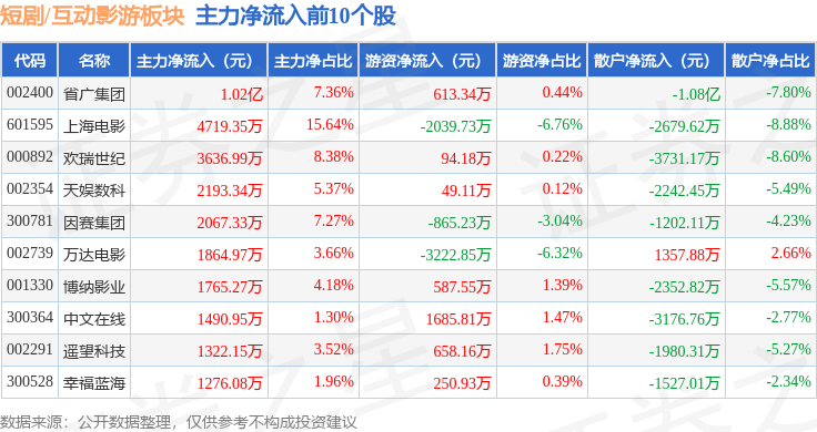 从资金流向上来看,当日短剧/互动影游板块主力资金净流出2.47亿元,游资资金净流出7383.18万元,散户资金净流入3.2亿元。短剧/互动影游板块个股资金流向见下表: