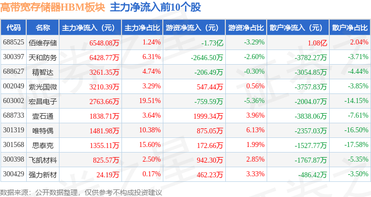 从资金流向上来看,当日高带宽存储器HBM板块主力资金净流出11.51亿元,游资资金净流入3.36亿元,散户资金净流入8.15亿元。高带宽存储器HBM板块个股资金流向见下表: