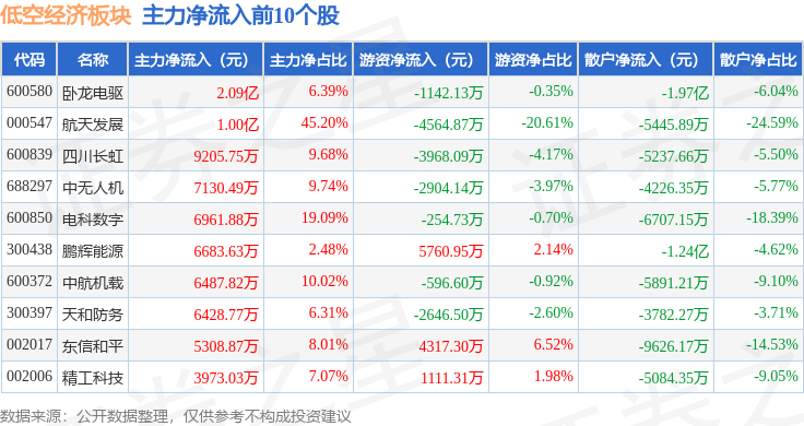 从资金流向上来看,当日低空经济板块主力资金净流出18.4亿元,游资资金净流入3.78亿元,散户资金净流入14.62亿元。低空经济板块个股资金流向见下表: