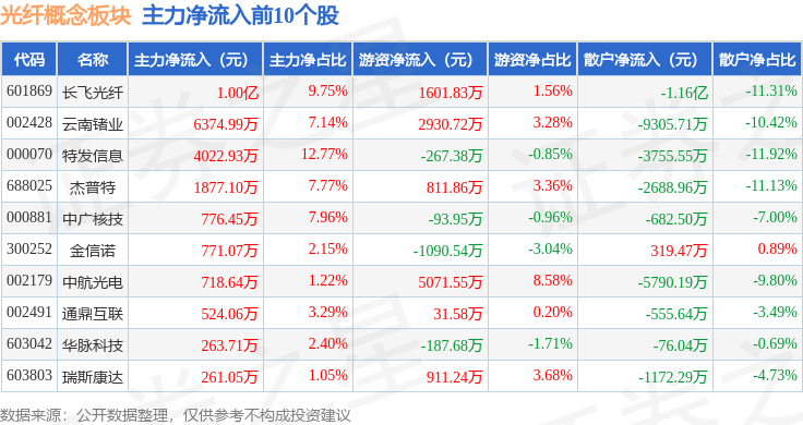 从资金流向上来看,当日光纤概念板块主力资金净流出3.18亿元,游资资金净流入2.19亿元,散户资金净流入9891.48万元。光纤概念板块个股资金流向见下表: