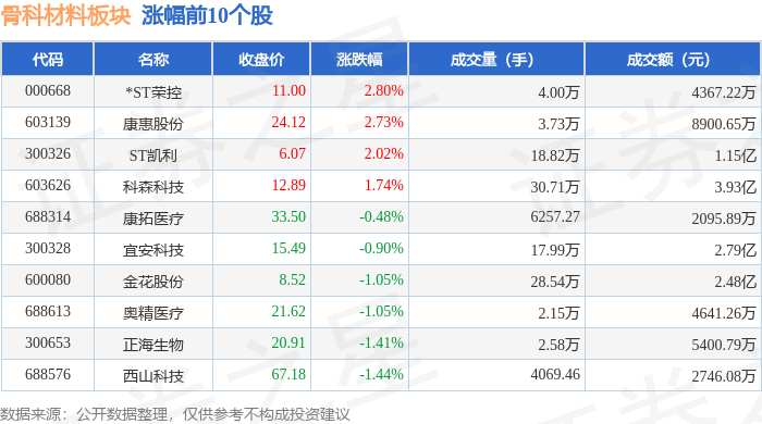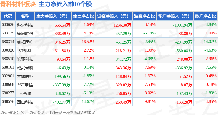 从资金流向上来看,当日骨科材料板块主力资金净流出1.62亿元,游资资金净流入2275.0万元,散户资金净流入1.39亿元。骨科材料板块个股资金流向见下表: