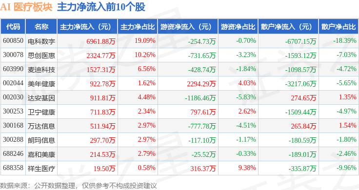 从资金流向上来看,当日AI 医疗板块主力资金净流出5183.41万元,游资资金净流入5934.87万元,散户资金净流出751.46万元。AI 医疗板块个股资金流向见下表: